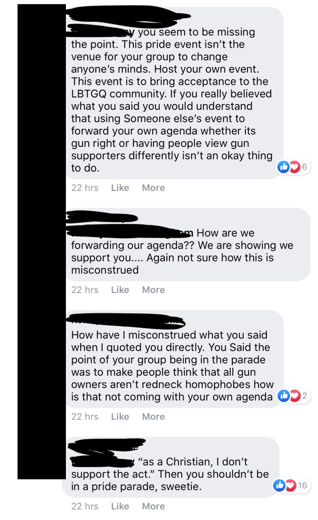 So, a pro second amendment group wanted to have their members who supported/were part of the LGBTQ community march and show support for the parade and LGBTQ Rights, but were told at the last minute they were no longer welcome to march in it. I also like the comment made to IGOT that stated “I don’t care if your supporters shit glitter and rainbows”. So tolerant and welcoming. That’s not all, though:
