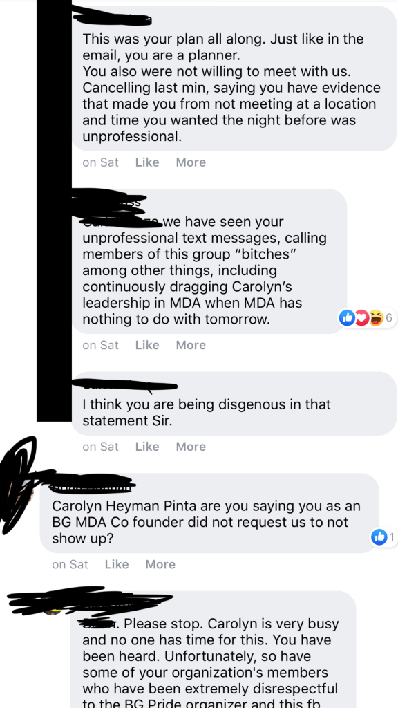 I’m going to keep this short, but it’s a story that needs to be told. The first annual BG Pride parade happened on 6/2/19. The Parade was organized by Carolyn Pinta and her family to support their openly gay daughter, Molly. It’s an honorable thing for a parent to do for their child. It’s what parents should do (support their children). According to Carolyn, everyone was welcomed to attend and participate: