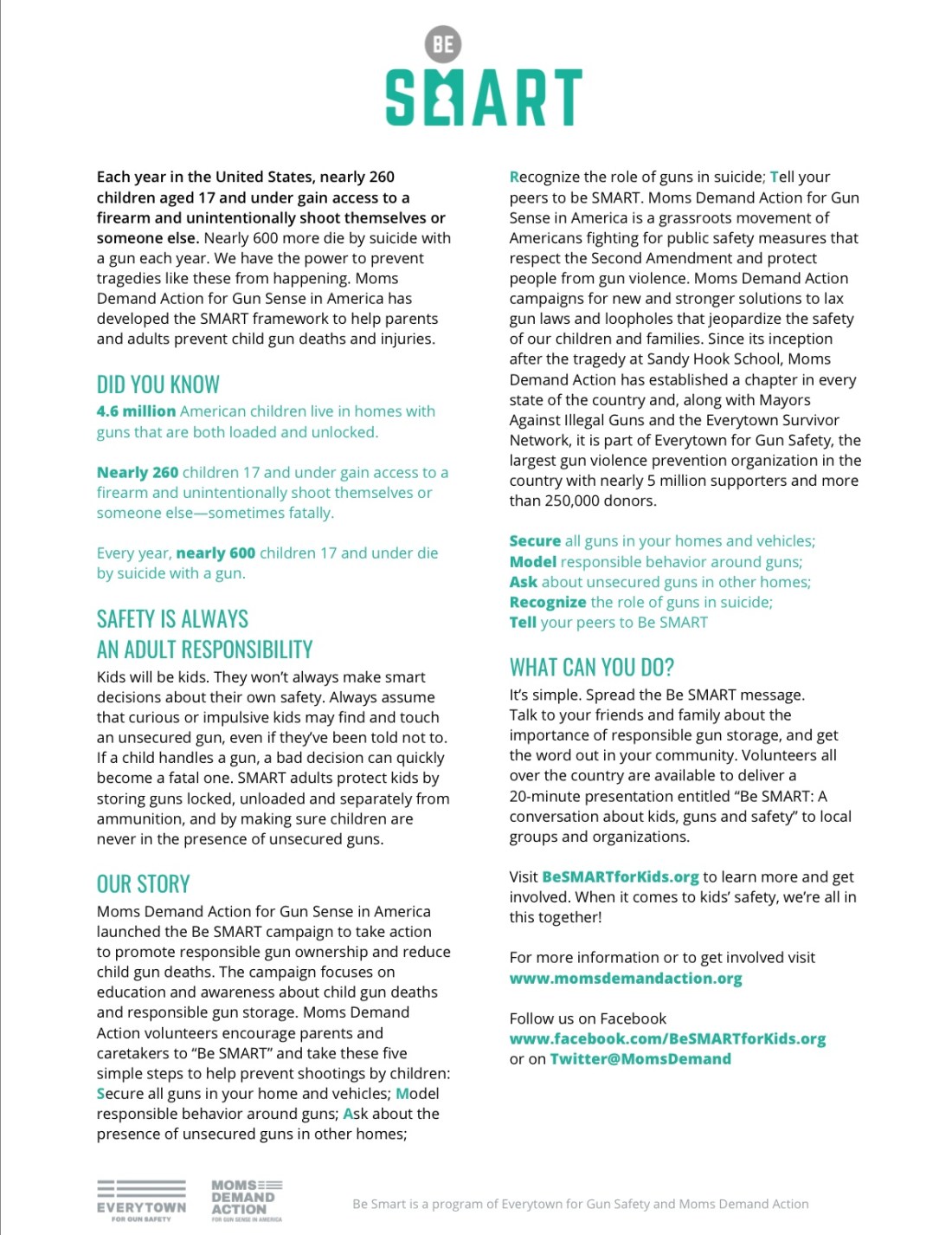 A community safety fair in which Moms Demand Action is a heavily involved participant. Oddly, that area of Illinois until recently was been pretty free of Bloomberg’s “grassroots” army. Looks like they’re starting to recruit in places they know will be a hard sell, so let’s dive into what “Be SMART” is.